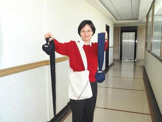 陳姝希說,「悠樂袋」的帶子與球間以鈕扣銜接,帶子縮短時,也可當作按摩棒,解開鈕扣后,帶子跟球體就可分開,長帶子可充當伸展帶。球體展開后,就是一般的肩背包,外出購物時可當購物袋,因為兼具運動及日常生活的便利功能,所以稱之為「悠樂袋」。
