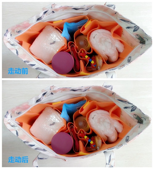 因為品牌媽咪包沒有功能區的劃分,所以當背上包包走動后,包包內部有如下的變化: