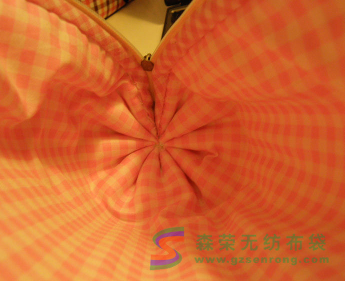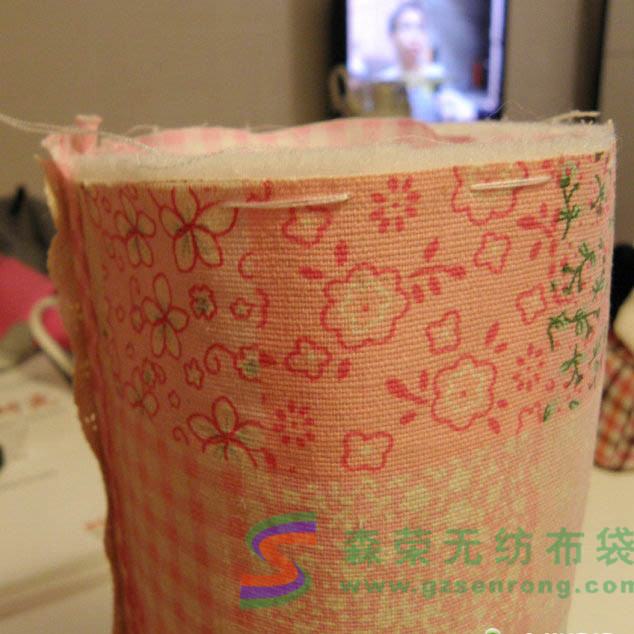 第二步,收緊兩頭做出圓筒狀。這一步看起來(lái)難,其實(shí)非常簡(jiǎn)單。針穿透全部的表里布以及鋪棉,采用平針疏縫,但是間距要大,(如果間距太小拉緊的時(shí)候會(huì)比較吃力),而且間距注意要均勻(包型對(duì)稱漂亮就靠它了),如果不成功可以多試幾次。