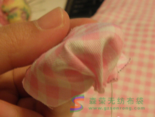此時(shí)最好剪一塊布對(duì)封口處進(jìn)行加固,因?yàn)槔o的地方有可能會(huì)松掉,而這塊布以后會(huì)被擋住,針腳神馬的不用太在意: