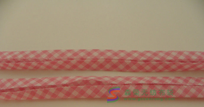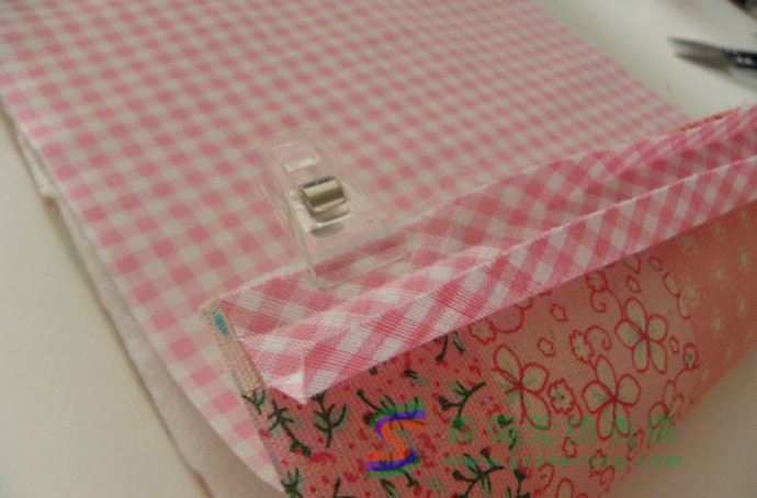 然后將包邊條和表布重合,如圖,然后將包邊條翻過(guò)去,背面用藏針縫縫好。